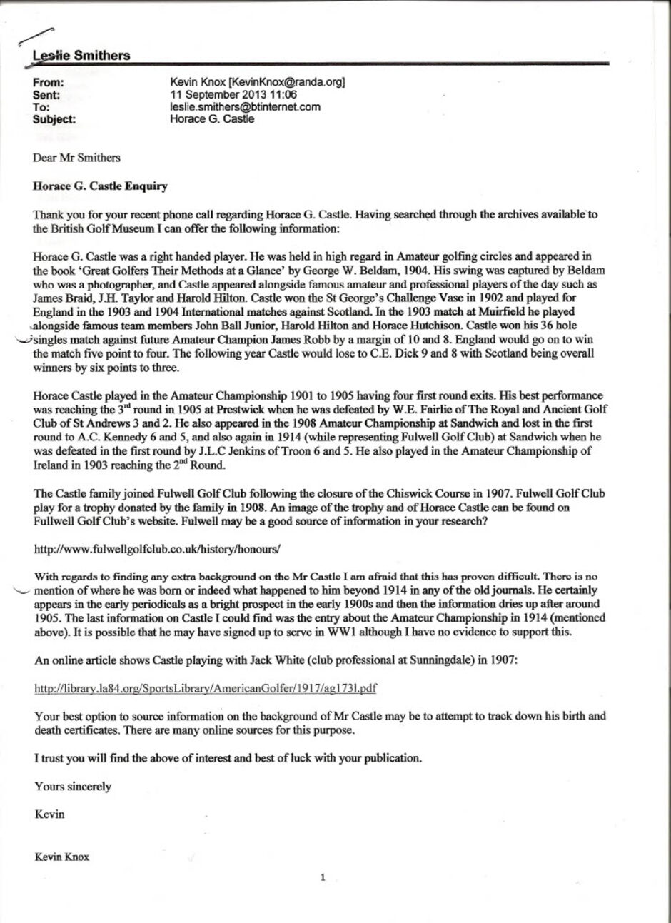 Horace Castle was a member of Epsom, Chiswick, Fulwell and Lahinch and possibly others. He was one of the foremost amateur golfers of his time.