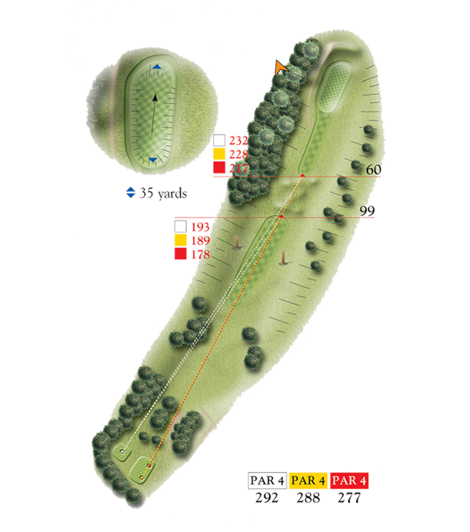 Hole 16 is a picturesque hole straight down the valley. Although not a long par 4 the tiered green requires the golfers full attention to achieve par.