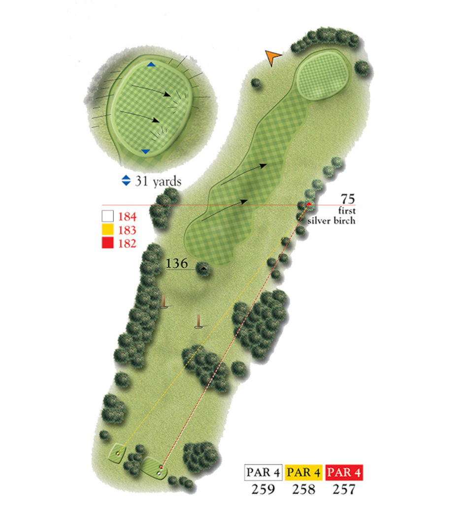 A shortish par 4 on which tee shots tend to run to the right towards the trees and rough. Being stroke index 17 it’s one of the easier holes on the course but beware the large undulating green and if the ball comes to rest above the pin the golfer must give the putt full respect.