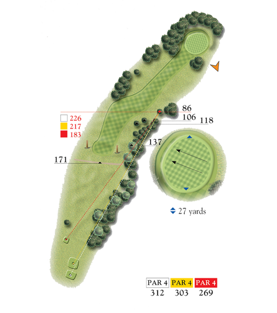 This strong par 4 with a sweeping right hand dog-leg, on which the player must aim for the middle of the fairway, avoiding the trees on the right and rough on the left. Beware the tree standing guard on the right front of the green which has captured many a stray ball.